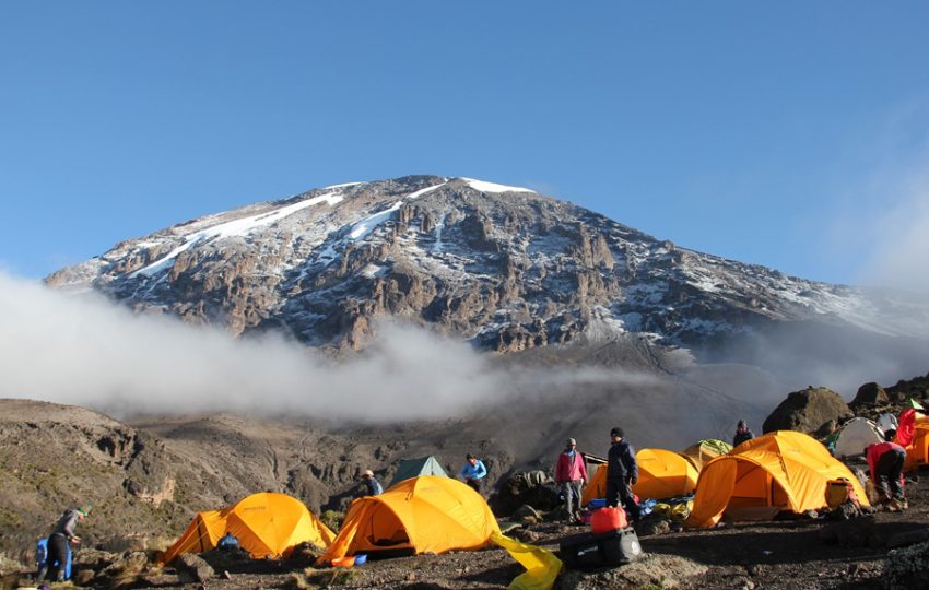 The morning after breakfast with packed picnic lunch; continue walking to Shira cave campsite. The day is clear, walking on the heather and moorland zone. Today the trail is a bit steep. Two peaks Shira and Kibo seen well. Get a great view of Mount Meru in Arusha as well. The walks take about 4-5 hours. Dinner and overnight at Shira cave campsite 3,750m. Full board basis.